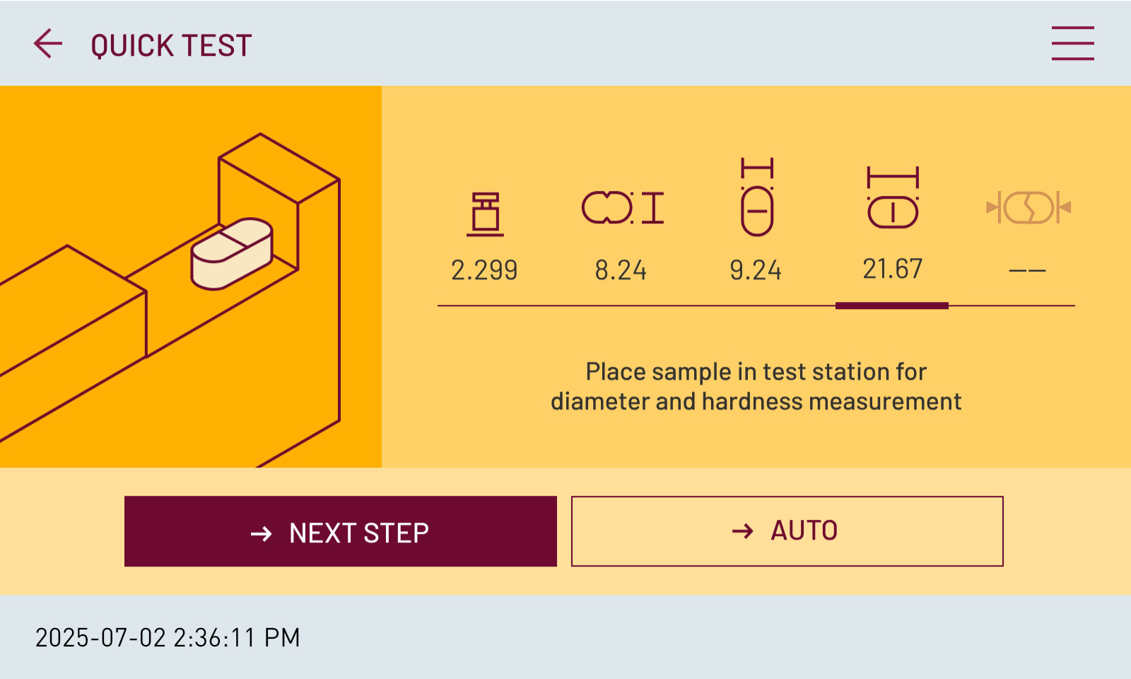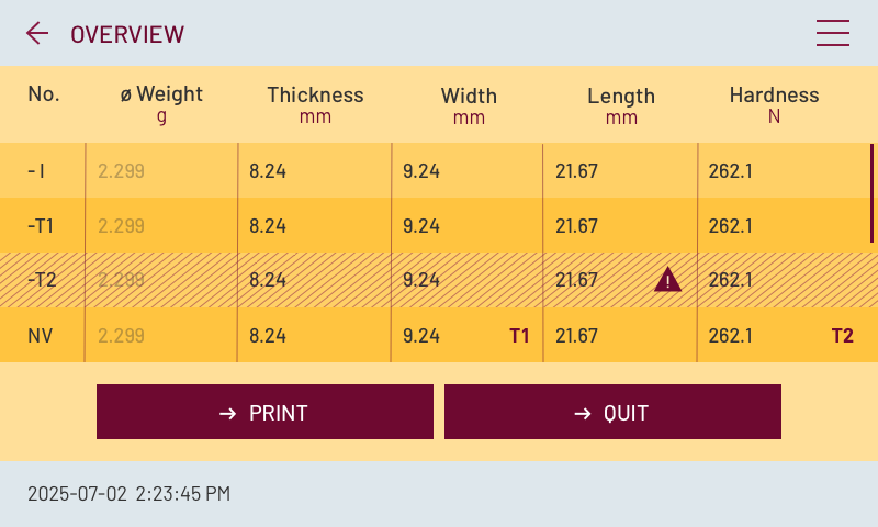 • Medición automática de dureza, espesor, diámetro y peso.
